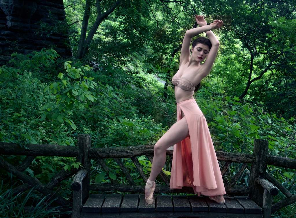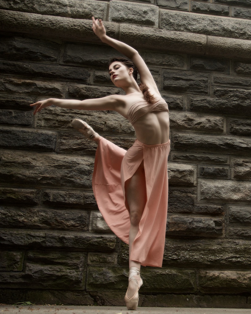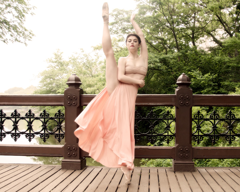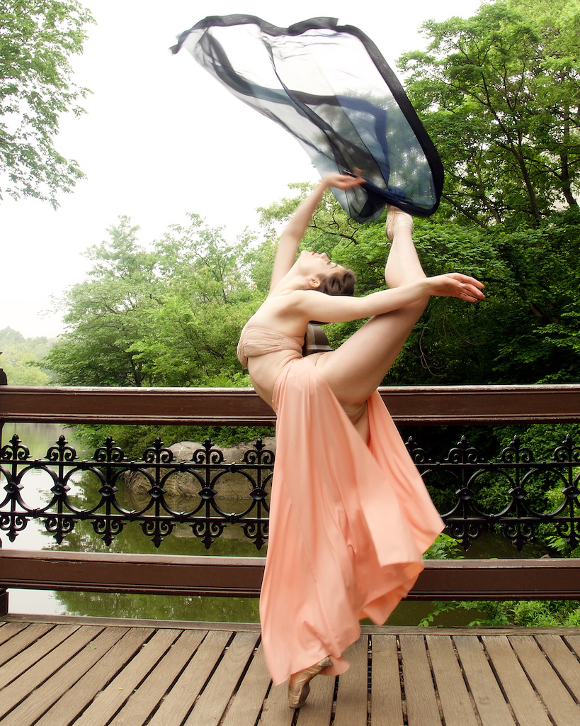 This shoot was very mellow and relaxed…just wandering the park looking for interesting backgrounds, done in about and hour and a half. When Brittany showed me this peach outfit, I was excited to shoot her against grays and greens. Interesting how some of these don’t look like they were taken in NYC…little more of a fairy tale vibe. When we got the bridge, we encountered some tourists with two little girls. They were quite mesmerized with meeting a real ballerina! Brittany was so sweet to them and they all got on their toes while the parents snapped a picture.