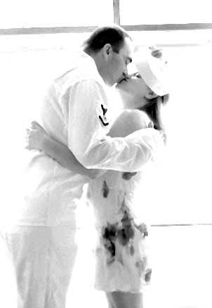 Well…it’s my 13th wedding anniversary, so that gives me an opportunity to share one of my oldest shots. This was taken about a week after we got married. As you can see, my husband was in the Navy at the time and we had to rush off to get married before he shipped out to Japan. We got married in a court in Flagstaff, AZ and exchanged rings at the grand canyon…where he almost slipped off the edge! Very grateful for that handy branch he grabbed onto. Our honeymoon consisted of a drive across the country back to the east coast, and it was a blast…and a great way to spend time together for the many months we spent apart. We arrived home, and I demanded we do this since we didn’t on the actual day. I shot this myself with a tripod and timer. Grainy, horrible scan, but I like it 🙂
